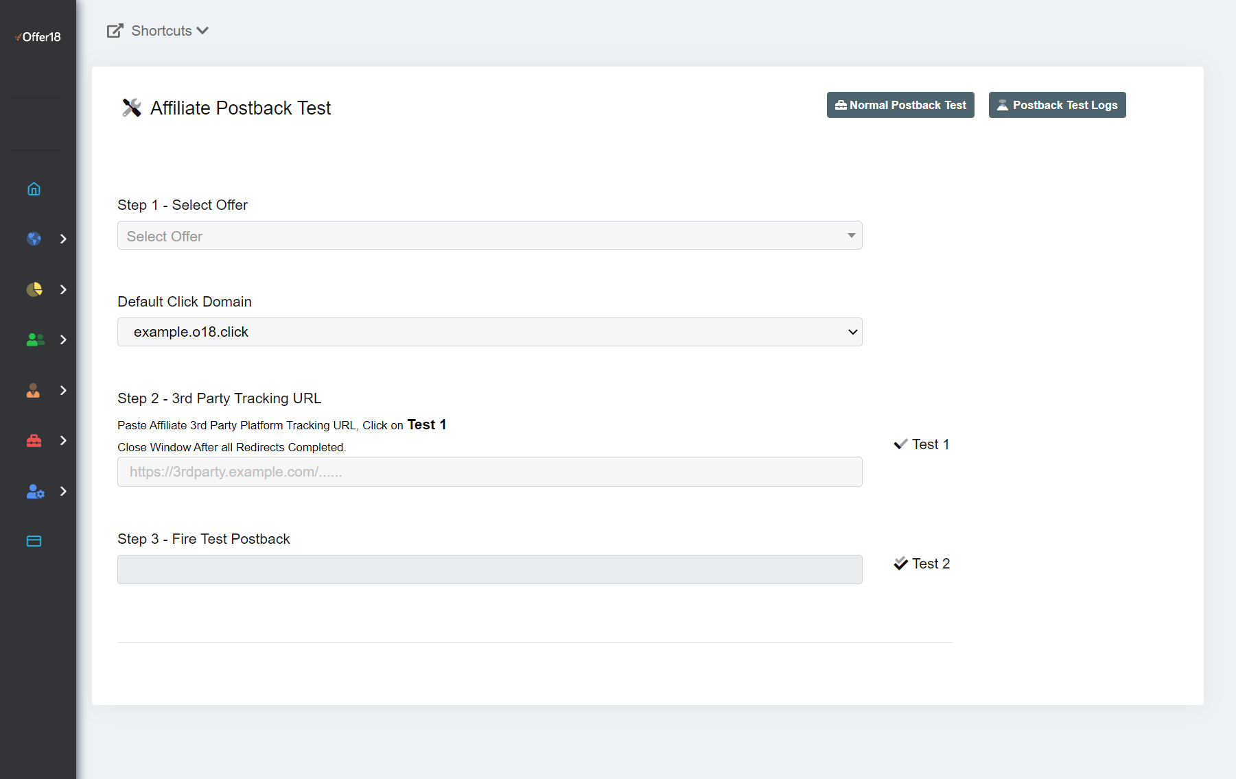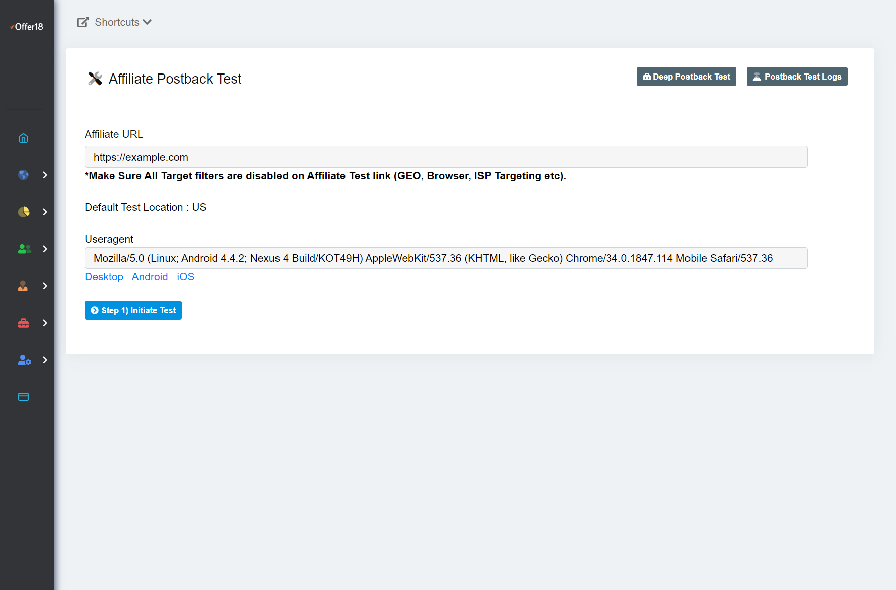 La Prueba de Postback Profunda es para pruebas con un Afiliado a un nivel avanzado. En esta prueba, la actividad de Conversión entre el usuario Administrador de la plataforma Offer18 y sus Afiliados funciona como la actividad de Conversión real del sistema.<br>