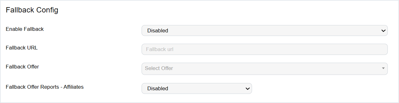 <table data-header-hidden><thead><tr><th width="335.1050364866276"></th><th></th></tr></thead><tbody><tr><td><strong>Field</strong> </td><td><strong>Description</strong></td></tr><tr><td>Enable Fallback</td><td>Enable / Disable the state of Fallback</td></tr><tr><td>Fallback URL</td><td>Custom URL on which user wants to divert the traffic</td></tr><tr><td>Fallback Offer</td><td>Select already created an Offer on which the user wants to divert traffic</td></tr><tr><td><p>Fallback Offer Reports - </p><p>Affiliate </p></td><td>Enabling this will show Fallback Offer Reports to Affiliate</td></tr></tbody></table>