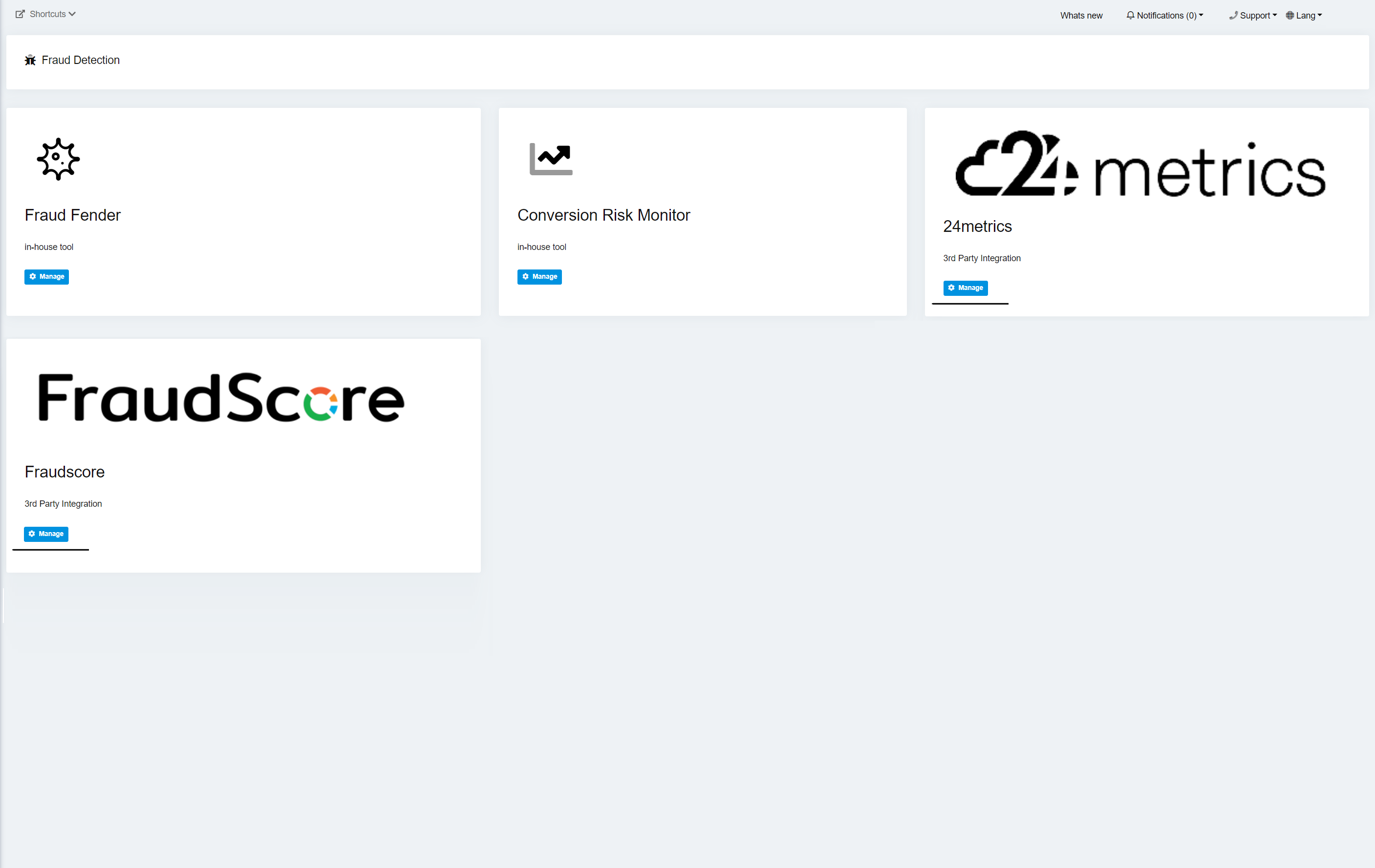 A integração com esses parceiros não é gratuita. Usuários do Offer18 que desejarem ativar a atividade de monitoramento de fraude por qualquer um desses parceiros devem ter uma conta com eles. Nessa conta, será fornecida uma chave pública que será usada para o rastreamento paralelo do tráfego e o monitoramento de cada clique processado.